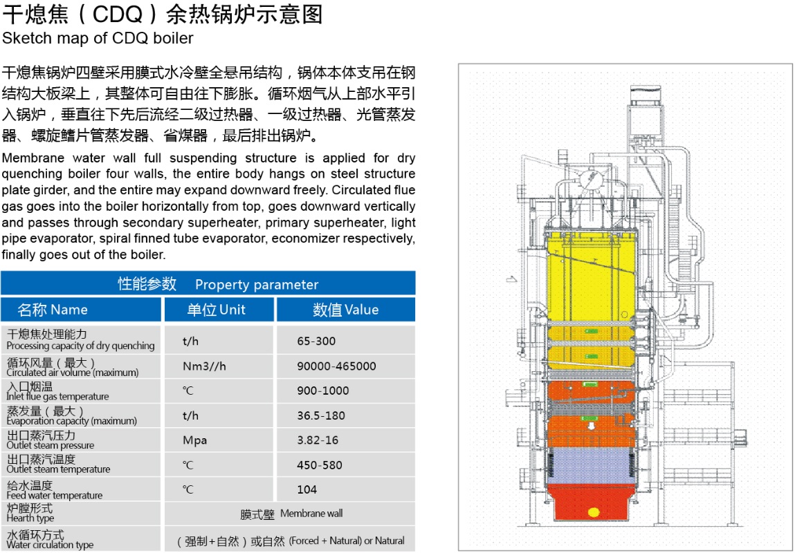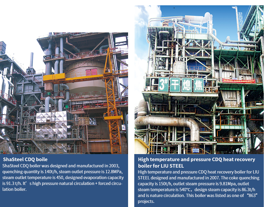 The CDQ products absorbed foreign advanced technology and combined with China's specific conditions, are strict controlled in design, technology, materials, manufacturing and testing and other aspects, to take special protective measures for the weakest link in the boilers. to maximize thermal efficiency of the boiler and the service life . The high temperature and pressure CDQ heat recovery boiler was included in the National 863 plan, the State Torch Program and Jiangsu Province scientific and technological achievements into special funds to support. and R & D results get rewards of the second prize of national science and technology progress and the China Metallurgical Science and Technology Award; At the same time, The High temperature and pressure CDQ heat recovery boiler was included in the national key new products and high-tech products, anti-corrosion, broke through the waste heat boiler sealing and preventing the expansion of a number of patented technologies, to develop and participate in YB/T 4255-2012 "CDQ energy-saving technical specifications" industry technical standards; through patents, patent standardization strategy, build the core competitiveness of product market.